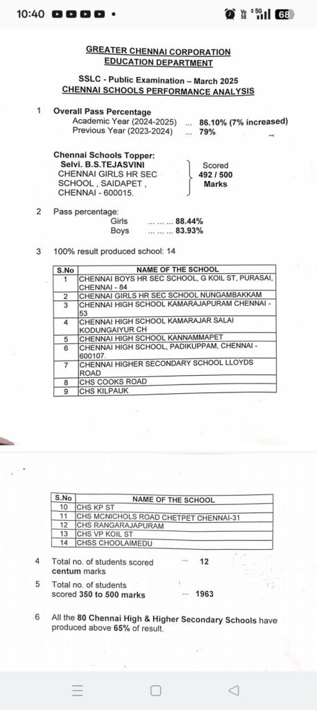 சென்னை மாவட்ட அளவில் மாநகராட்சி பள்ளிகளில் சைதாப்பேட்டை மாதிரி மேல்நிலைப் பள்ளி மாணவி தேஜஸ்வினி 500க்கு 492 மதிப்பெண் பெற்று முதலிடம் பிடித்துள்ளார் .