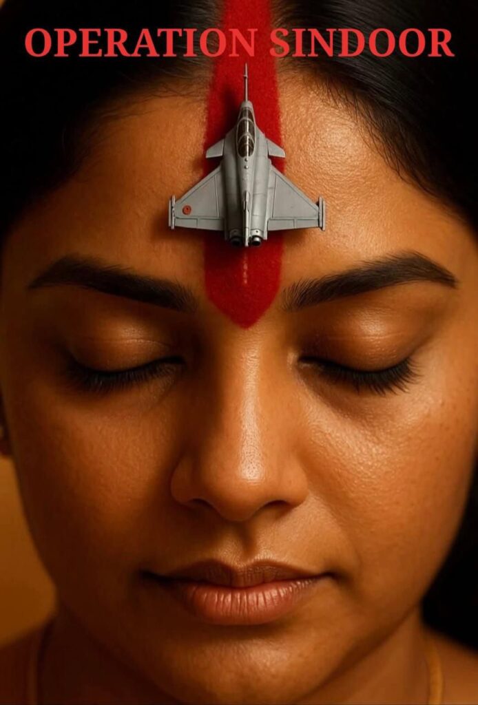 சிந்தூரில் உள்ள இரண்டாவது ‘ஓ’ ஒரு பாரம்பரிய குங்குமப்பூ கிண்ணத்துடன் வடிவமைக்கப்பட்டுள்ளது – திருமணமான இந்து பெண்களின் புனித சின்னம் – அதன் அடர் சிவப்பு நிறம் தியாகம், நீதி மற்றும் தேசிய பெருமை பற்றி நிறைய பேசுகிறது.